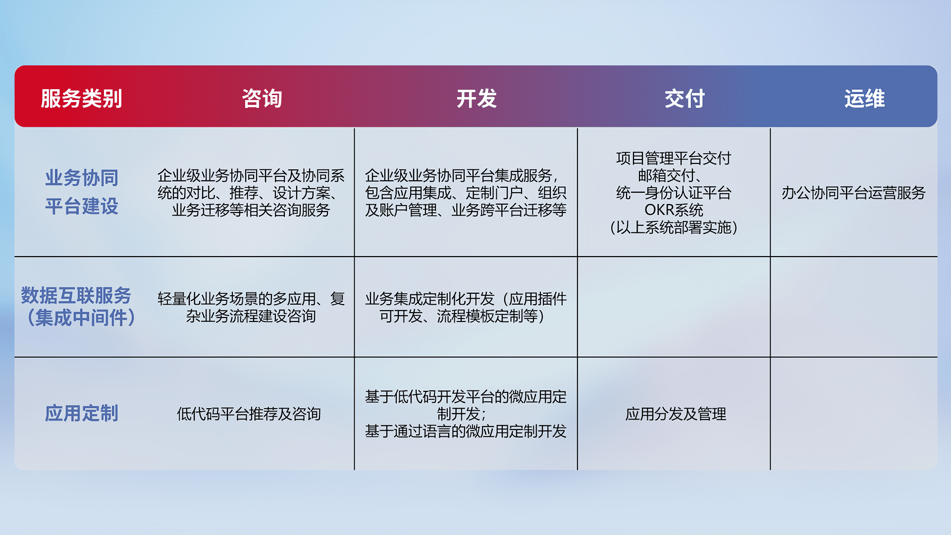 针对钉钉、、、、企微、、、IDaas等平台级产品提供产品的规划、、、、方案、、交付、、、、定制化开发等服务,,,实现如统一协同办公、、、、智能客户服务、、混合会议管理、、智能数据查询、、等业务场景,,实现数字化转型。。