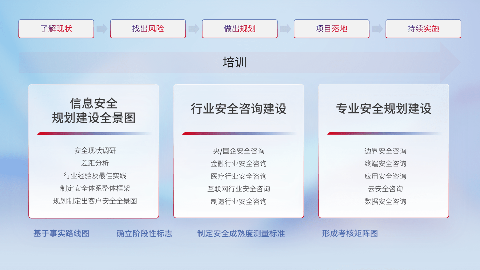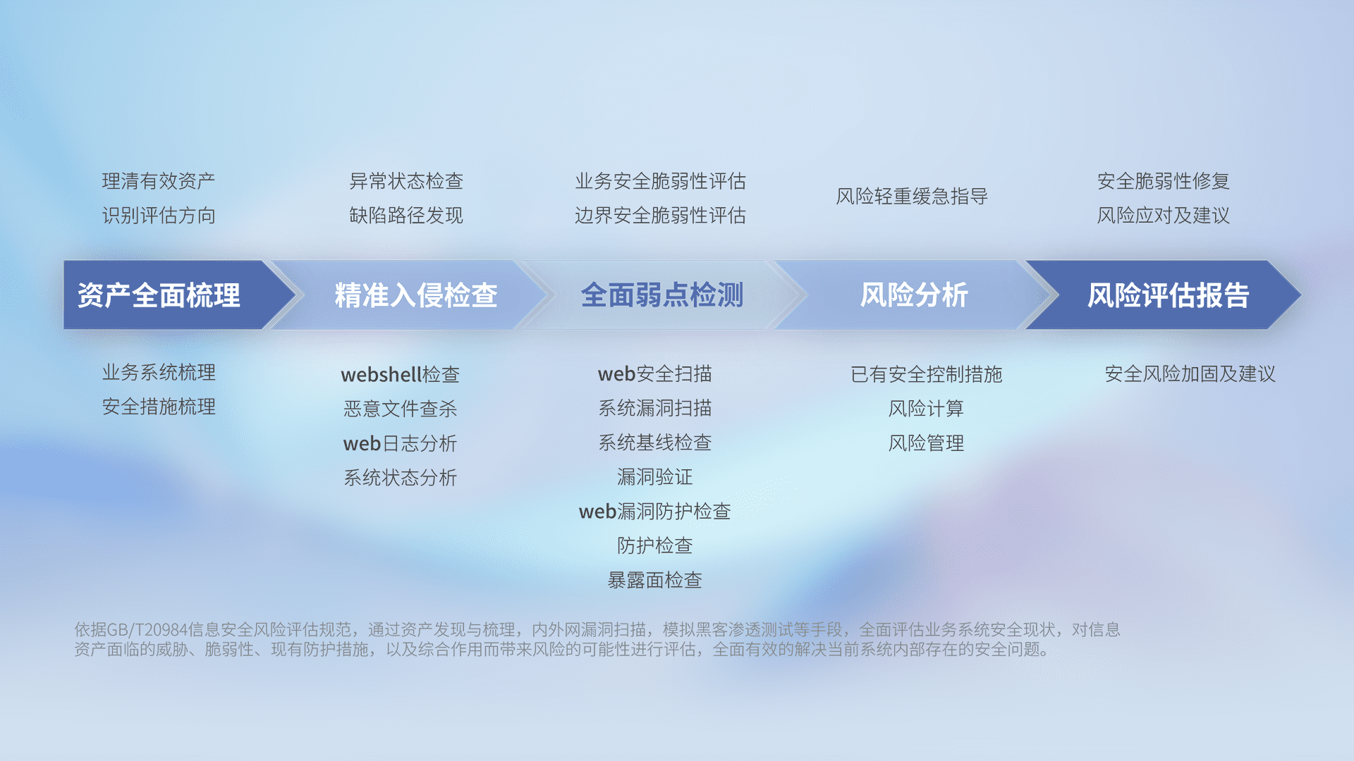 针对客户行业特性,,,以专业的安全服务+多厂商联合解决方案提供专属的一站式安全管理服务,,帮助客户全面感知网络空间威胁,,,基于识别、、、、检测、、、、分析、、、、防护、、、、监测、、、响应的服务理论模型,,,从方案咨询、、集成交付、、、评估验证、、、优化加固、、、、运维运营,,,致力于为客户提供完整的闭环管理式安全服务。。以实战经验为客户打造高抵御风险的安全体系,,,帮助客户发现威胁、、、、对抗威胁、、处置威胁,,,,不断积累安全对抗能力,,持续保障数字化安全。。